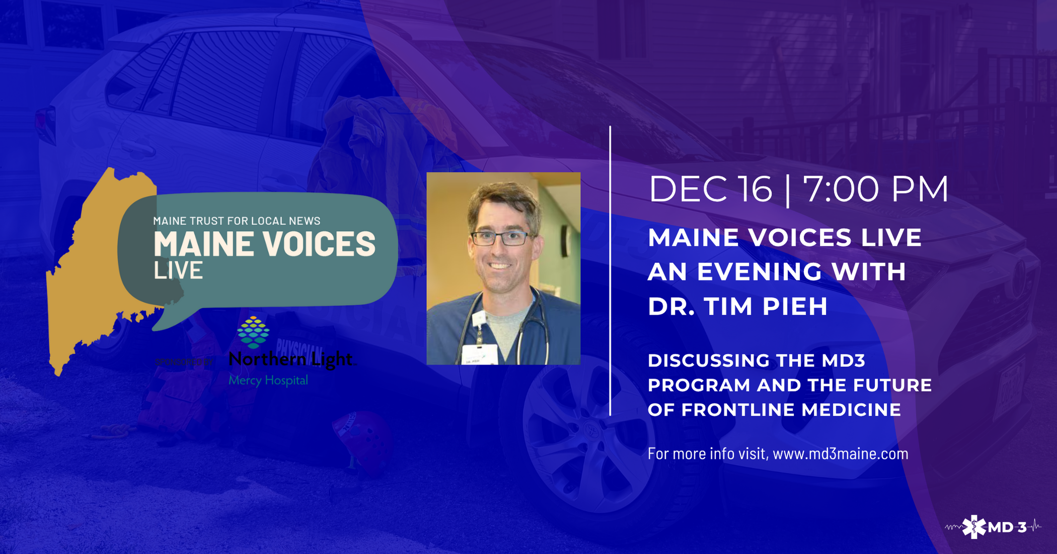 We are incredibly proud to announce that MD3’s own Chief Medical Director, Dr. Tim Pieh, will be the featured guest at the upcoming Maine Voices Live event in Waterville.